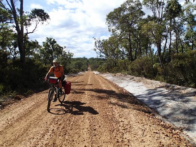 The maps and other blogs give us good clues, as well as the spacing of the campsites. You can get a lot out of the map by carefully examining it. The trail is marked in solid blue with yellow dots, solid red lines are roads, long dashed red lines are dirt roads, thinner ones single lane trails, and small dashes are tracks. The Munda Biddi track is superimposed on these road/track marks. Some improvement can be made on the maps by making the Munda Biddi trail marker translucent so you can readily identify the trail type rather than making a guestimate. Also whole sections of the map are wasted with information that could be better placed on the cover leaf - detail such as 'be careful' notes are better placed as an information insert leaflet. It is important to have as much as the map present so that informed decisions can be made about escape routes should an early exit be required.